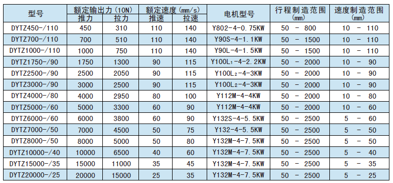某一場所需要一台整體直(zhí)式的電液推杆,要求電機防爆,其最大推力為(wéi)1KN,行程500mm, 最大速度(dù)110mm/s,使用角度向下推,那麽所(suǒ)選電液推杆的標準型號為:DYTZB1000-500/110-X
